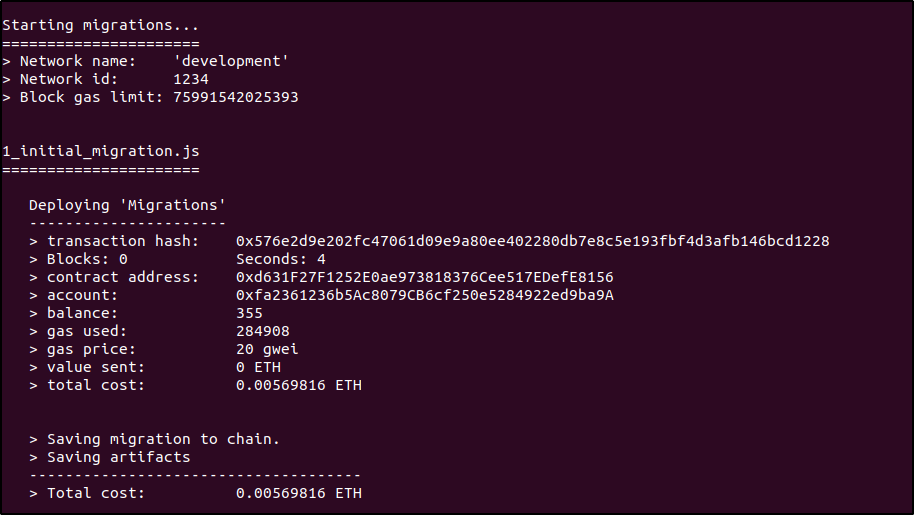 and then, go back to the terminal which has “truffle” as the present working directory and run the following command: