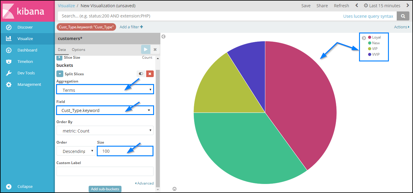Aggregation is a framework which helps in aggregating data through a search query. Small aggregations can be joined together in order to build up complex summaries of the data provided. Let’s perform a simple aggregation to check how many types of customers do we have in our index: