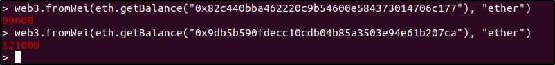 > web3.fromWei(eth.getBalance("0x82c440bba462220c9b54600e584373014706c177"), "ether")> web3.fromWei(eth.getBalance("0x9db5b590fdecc10cdb04b85a3503e94e61b207ca"), "ether")Yay! We can see that 1000 ethers were sent from one account to another!