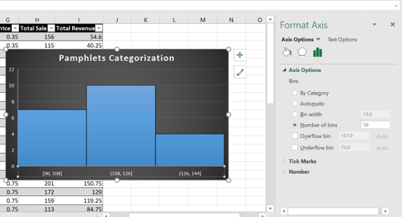 A new window will open on the right named Format Axis. In this window, change the Number of Bins option to 10.