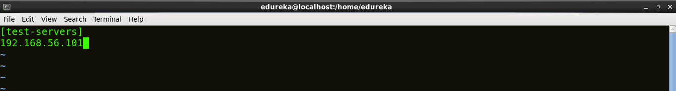Step 4: Now, you can use any editor to write your inventory or specify the IP addresses of your nodes grouped under ‘test-servers’ (or whatever you want your group name to be). I am using the vi editor.