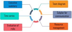 An executive summary, timeline or Gantt chart, resource management subplan, risk assessment, communication subplan, and team chart are all necessary components of a project management plan. Below is a synopsis of every one of these sections: