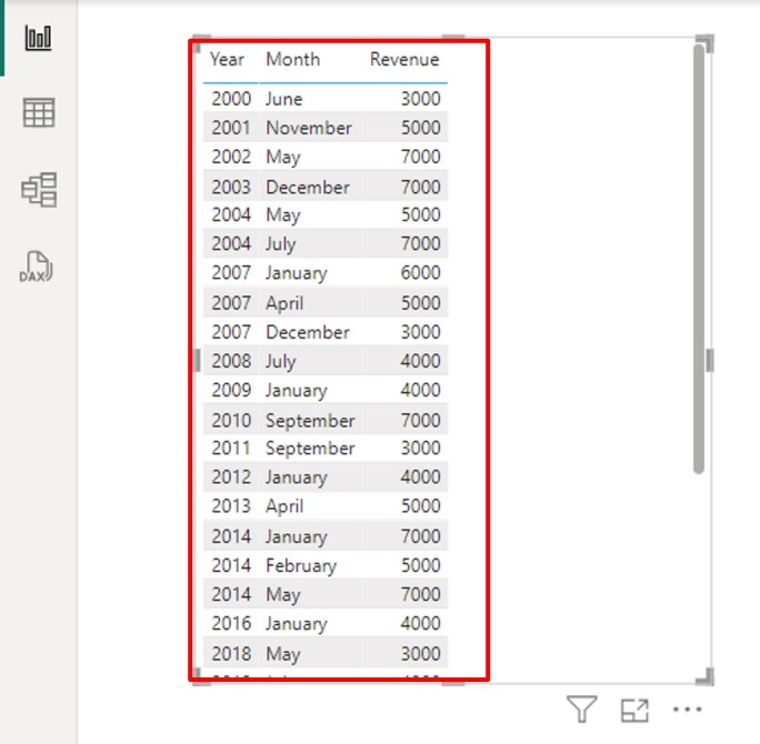 13. Visually insert the table, starting with the “Date” and “Revenue” columns.