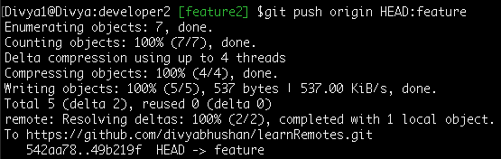 Reminder: ‘HEAD’ is the latest commit on the local ‘feature2’ branch.