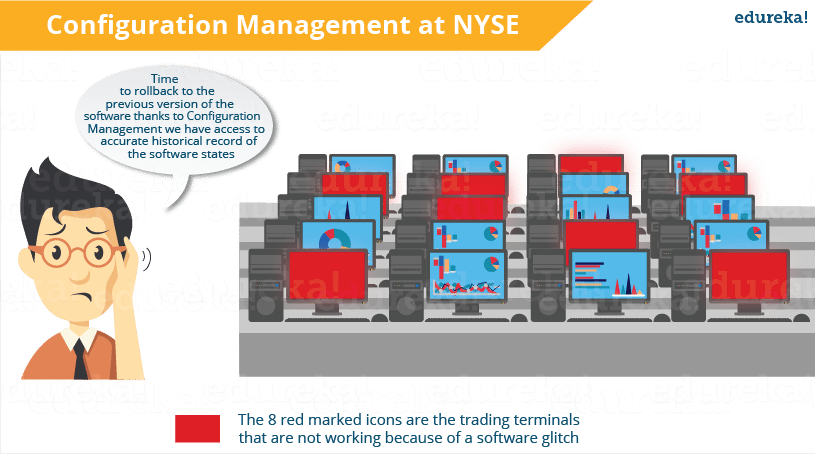 The best example I know is of the New York Stock Exchange (NYSE). A software “glitch” prevented the NYSE from trading stocks for almost 90 minutes. This led to millions of dollars of loss. A new software installation caused the problem. That software was installed on 8 of its 20 trading terminals and the system was tested out the night before. However, in the morning, it failed to operate properly on the 8 terminals. So there was a need to switch back to the old software. You might think that this was a failure of NYSE’s Configuration Management process, but in reality it was a success. As a result of a proper Configuration Management process, NYSE recovered from that situation in 90 minutes which was pretty fast. Had the problem continued longer, the consequences would have been more severe.