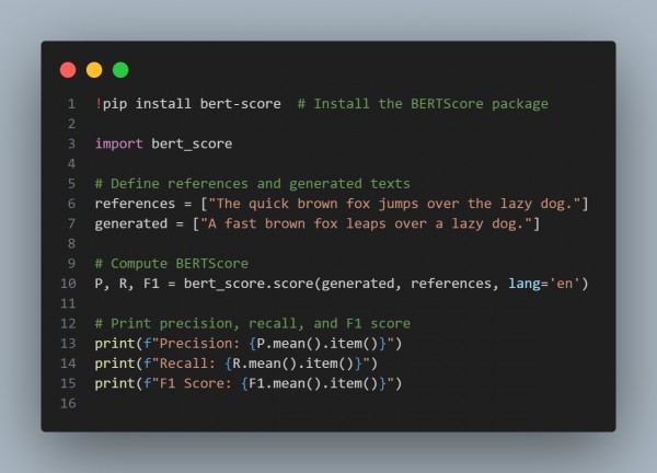- BERTScore: Measures semantic similarity using pre-trained BERT embeddings.
