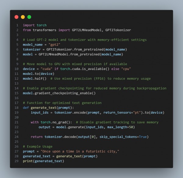 - Mixed Precision (FP16) – Uses model.half() to reduce memory consumption while maintaining performance.